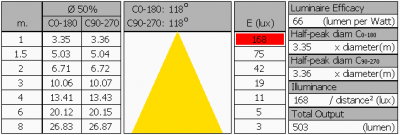 Bij het berekenen van de gemiddelde lichtsterktewaarden per hoek en deze uit te zetten in een grafiek, is de stralingshoek te bepalen: dit is berekend op 118 graden voor het C0-C180 vlak en 118 graden voor het C90-C270 vlak.