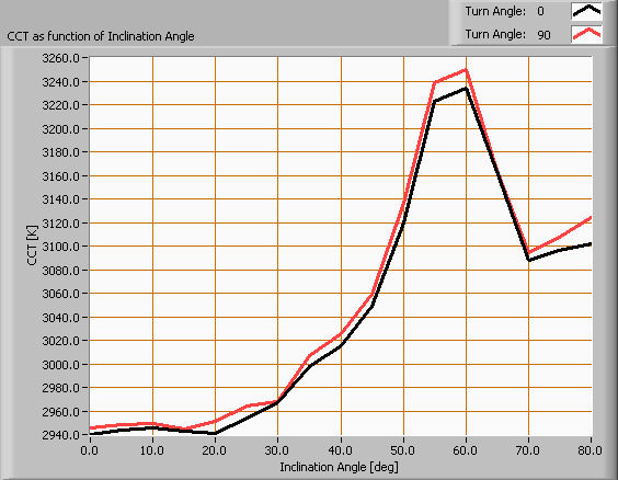 Voor het C0-C180 vlak: kijkende naar de stralingshoek van 79 graden dan komt dit overeen met 39.3 graden kantelhoek, dit is het gebied waar het meeste van het licht afgegeven wordt. De maximale variatie in kleurtemperatuur in dit gebied (kantelhoek) is ongeveer 3 %.