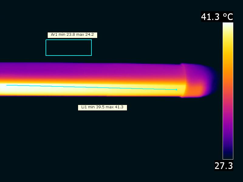 De lamp wordt maximaal ongeveer 34 graden warmer dan omgevingstemperatuur. Opwarmeffect: Gedurende de opwarming varieert de verlichtingssterkte gedurende 23 minuten en neemt dan 9 % af. Afhankelijkheid spanning: Er is geen (significante) afhankelijkheid van de verlichtingssterkte wanneer de voedingsspanning tussen de 200 – 250 V AC varieert. Aan het eind van het artikel een extra foto. |