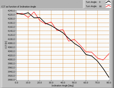 Voor het C0-C180 vlak: kijkende naar de stralingshoek van 118 graden dan komt dit overeen met 59.0 graden kantelhoek, dit is het gebied waar het meeste van het licht afgegeven wordt. De maximale variatie in kleurtemperatuur in dit gebied (kantelhoek) is ongeveer 4 %.