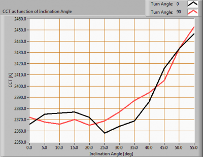 De meting is gedaan recht onder de lamp. De kleurtemperatuur kan ook worden gemeten onder verschillende kantelhoeken.