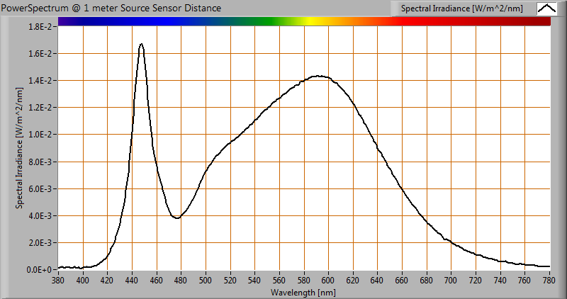 Het kleurspectrum van het licht van deze lamp. Energieniveaus geldig op 1 m afstand.