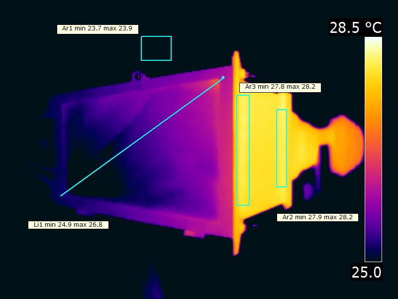 | Algemene opmerkingen | De omgevingstemperatuur gedurende de hele set van verlichtingsterktemetingen was 25.1 – 25.6 deg C.De lamp wordt maximaal ongeveer 4 graden warmer dan omgevingstemperatuur.Opwarmeffect: Gedurende de opwarming varieert de verlichtingssterkte niet significant (< 5 %).Gedurende de opwarming varieert het vermogen niet significant (< 5 %). De variatie in efficiëntie (hier indicatief berekend door deling van verlichtingssterkte door vermogen) door het opwarmen is -1 %. Een erg hoog negatief getal duidt op een significante afname door bijvoorbeeld warm worden van de lichtbron (lagere levensduur).Afhankelijkheid spanning: Er is geen (significante) afhankelijkheid van de verlichtingssterkte wanneer de voedingsspanning tussen de 200 – 250 V AC varieert. Er is geen (significante) afhankelijkheid van het opgenomen vermogen wanneer de voedingsspanning tussen de 200 – 250 V AC varieert.Aan het eind van het artikel een extra foto. |