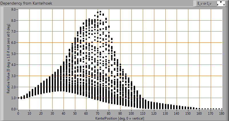 Deze plot geeft grafisch weer welke verschillende meetwaarden verkregen zijn bij iedere kantelhoek. Voor een bepaalde kantelhoek zijn er zo een aantal metingen, die afkomstig zijn van verschillende draaihoeken rondom de lamp.