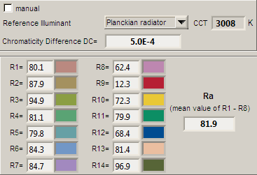 De “chromaticity difference” is 0.0005, wat aangeeft hoever de kleur van deze lamp afligt van het pad van de zwarte straler. Er wordt in sectie 5.3 van CIE 13.3-1995 een waarde genoemd van 5.4E-3 zonder verdere uitleg.