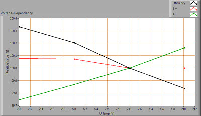 De lamp is onderzocht op hoe afhankelijk de parameters verlichtingssterkte E_v [lx] en het opgenomen netto vermogen P [W] zijn van de lampspanning. Uit de deling van E_v door P volgt een inschatting van de efficiëntie.