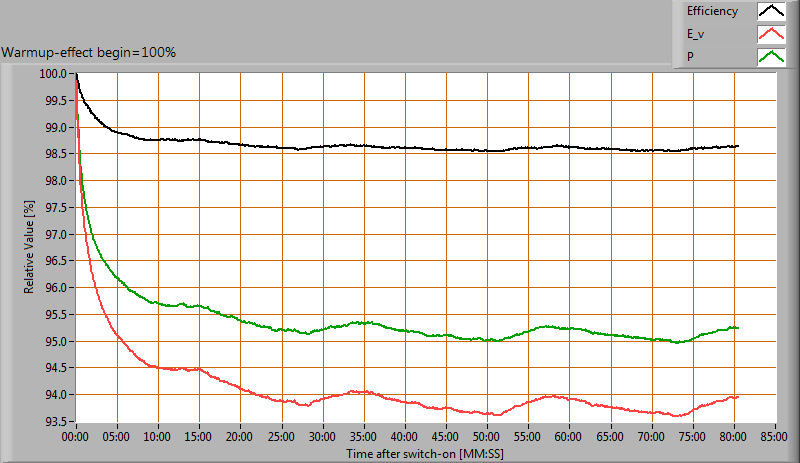 De variatie in efficiëntie (hier indicatief berekend door deling van verlichtingssterkte door vermogen) door het opwarmen is -1 %. Een erg hoog negatief getal duidt op een significante afname door bijvoorbeeld warm worden van de lichtbron (lagere levensduur).