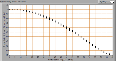 Deze plot geeft grafisch weer welke verschillende meetwaarden verkregen zijn bij iedere kantelhoek. Voor een bepaalde kantelhoek zijn er zo een aantal metingen, die afkomstig zijn van verschillende draaihoeken rondom de lamp.