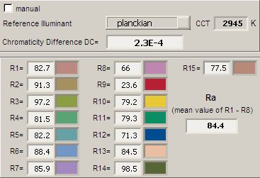 De “chromaticity difference” is 0.0002, wat aangeeft hoever de kleur van deze lamp afligt van het pad van de zwarte straler. Er wordt in sectie 5.3 van CIE 13.3-1995 een waarde genoemd van 5.4E-3 zonder verdere uitleg.