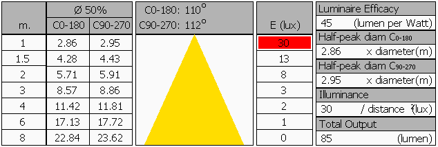 Met de meetgegevens van lux op 1 meter, gehaald uit het stralingsdiagram met de gemiddelde lichtsterktewaarden, is de lichtstroom te berekenen. Het resultaat van deze berekening voor deze lamp is 85 lm.