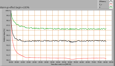De variatie in efficiëntie (hier indicatief berekend door deling van verlichtingssterkte door vermogen) door het opwarmen is -6 %. Een erg hoog negatief getal duidt op een significante afname door bijvoorbeeld warm worden van de lichtbron (lagere levensduur).