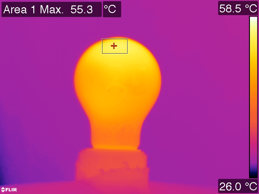 | Algemene opmerkingen | De omgevingstemperatuur gedurende de hele set van verlichtingsterktemetingen was 27.5 – 28.8 deg C.De lamp wordt maximaal ongeveer 32.5 graden warmer dan omgevingstemperatuur. IR_EXTRAINFOOpwarmeffect: Gedurende de opwarming varieert de verlichtingssterkte gedurende 7 minuten en neemt dan 13 % af. Gedurende de opwarming varieert het vermogen niet significant (< 5 %). De variatie in efficiëntie (hier indicatief berekend door deling van verlichtingssterkte door vermogen) door het opwarmen is -9 %. Een erg hoog negatief getal duidt op een significante afname door bijvoorbeeld warm worden van de lichtbron (lagere levensduur).Afhankelijkheid spanning: Er is geen (significante) afhankelijkheid van de verlichtingssterkte wanneer de voedingsspanning tussen de 200 – 250 V AC varieert. Er is geen (significante) afhankelijkheid van het opgenomen vermogen wanneer de voedingsspanning tussen de 200 – 250 V AC varieert. Aan het eind van het artikel een extra foto. |