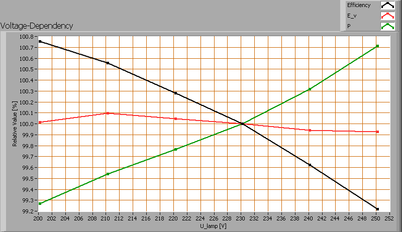 De lamp is onderzocht op hoe afhankelijk de parameters verlichtingssterkte E_v [lx] en het opgenomen netto vermogen P [W] zijn van de lampspanning. Uit de deling van E_v door P volgt een inschatting van de efficiëntie.