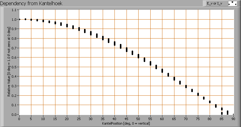 Deze plot geeft grafisch weer welke verschillende meetwaarden verkregen zijn bij iedere kantelhoek. Voor een bepaalde kantelhoek zijn er zo een aantal metingen, die afkomstig zijn van verschillende draaihoeken rondom de lamp.