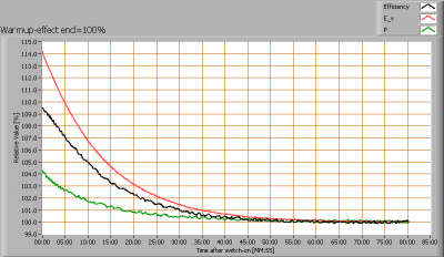 De variatie in efficiëntie (hier indicatief berekend door deling van verlichtingssterkte door vermogen) door het opwarmen is -9 %. Een erg hoog negatief getal duidt op een significante afname door bijvoorbeeld warm worden van de lichtbron (lagere levensduur).