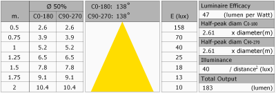 Bij het berekenen van de gemiddelde lichtsterktewaarden per hoek en deze uit te zetten in een grafiek, is de stralingshoek te bepalen: dit is berekend op 138 graden voor het C0-C180 vlak en 138 graden voor het C90-C270 vlak.