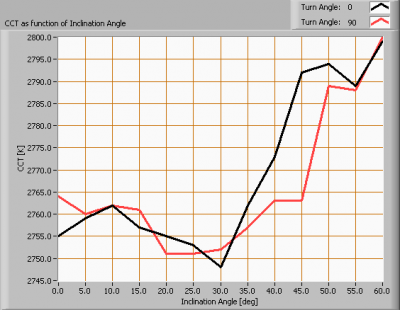 Voor het C0-C180 vlak: kijkende naar de stralingshoek van 41 graden dan komt dit overeen met 20.5 graden kantelhoek, dit is het gebied waar het meeste van het licht afgegeven wordt. De maximale variatie in kleurtemperatuur in dit gebied (kantelhoek) is ongeveer 0 %.