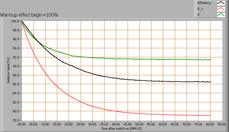 De variatie in efficiëntie (hier indicatief berekend door deling van verlichtingssterkte door vermogen) door het opwarmen is -14 %. Een erg hoog negatief getal duidt op een significante afname door bijvoorbeeld warm worden van de lichtbron (lagere levensduur).
