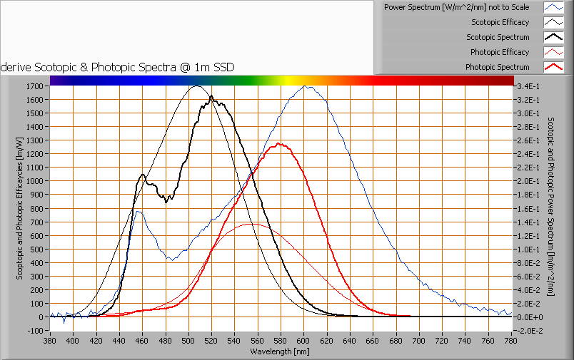 Het vermogensspectrum, de gevoeligheidscurven en de resulterende nacht – en dagspectra (laatste op 1 m afstand).