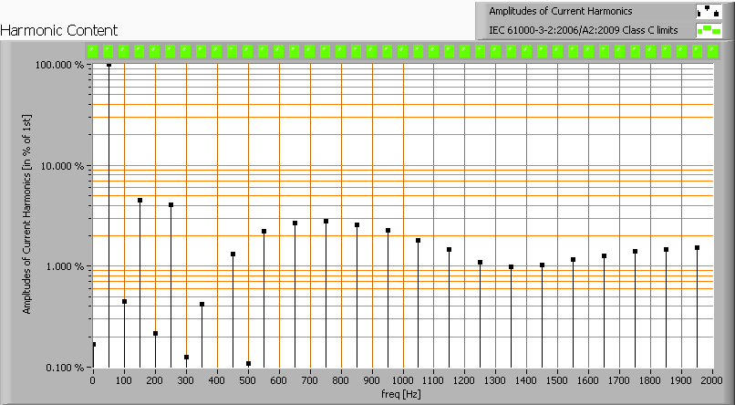 De harmonischen van de stroom uitgezet tegen de eisen voor harmonischen vanuit IEC61000-3-2:2006 A2:2009