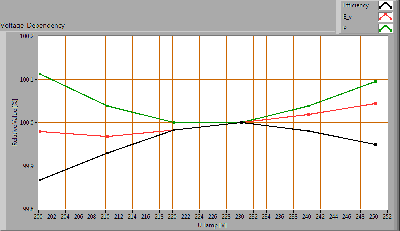 De lamp is onderzocht op hoe afhankelijk de parameters verlichtingssterkte E_v [lx] en het opgenomen netto vermogen P [W] zijn van de lampspanning. Uit de deling van E_v door P volgt een inschatting van de efficiëntie.