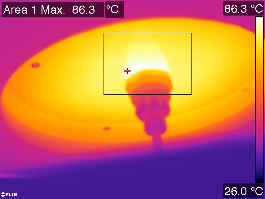 | Algemene opmerkingen | De omgevingstemperatuur gedurende de hele set van verlichtingsterktemetingen was 25.9 – 26.2 deg C.De lamp wordt maximaal ongeveer 61 graden warmer dan omgevingstemperatuur.Opwarmeffect: Gedurende de opwarming varieert de verlichtingssterkte gedurende 79 minuten en neemt dan 13 % af. Gedurende de opwarming varieert het vermogen niet significant (< 5 %). De variatie in efficiëntie (hier indicatief berekend door deling van verlichtingssterkte door vermogen) door het opwarmen is -9 %. Een erg hoog negatief getal duidt op een significante afname door bijvoorbeeld warm worden van de lichtbron (lagere levensduur).Afhankelijkheid spanning: Er is geen (significante) afhankelijkheid van de verlichtingssterkte wanneer de voedingsspanning tussen de 200 – 250 V AC varieert. Er is geen (significante) afhankelijkheid van het opgenomen vermogen wanneer de voedingsspanning tussen de 200 – 250 V AC varieert.Aan het eind van het artikel een extra foto. |
