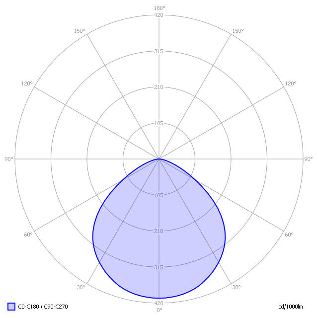 Het lichtdiagram geeft een bundel aan in het C0-C180 vlak en in het 90 graden loodrecht daarop staande C90-C270 vlak. Deze zijn gelijk vanwege de symmetrie over de 1e as (de verticale as).