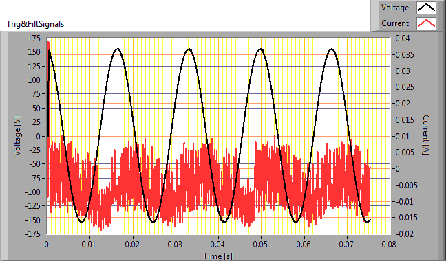 De inschakelstroom is gemeten voor de verschillende starthoeken van de spanning van 0 – 170 graden (met stap van steeds 10 graden). De stroom- en spanningswaardes zijn met een acquisitiefrequentie van 39.9 kS/s binnengehaald. Daarna zijn de meetresultaten door een 2e orde 2kHz laagdoorlaat Butterworth filter gehaald. Hiermee worden zeer kortdurende, niet relevante, (stroom)pieken weggefilterd.