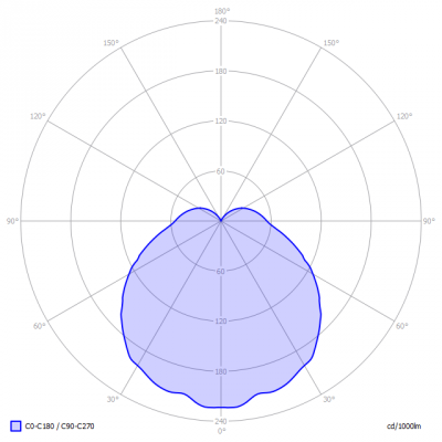 Het lichtdiagram geeft een bundel aan in het C0-C180 vlak en in het 90 graden loodrecht daarop staande C90-C270 vlak. Deze zijn gelijk vanwege de symmetrie over de 1e as (de verticale as).
