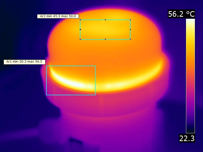 De lamp wordt maximaal ongeveer 37 graden warmer dan omgevingstemperatuur. Opwarmeffect: Gedurende de opwarming varieert de verlichtingssterkte gedurende 22 minuten en neemt dan 9 % af. Afhankelijkheid spanning: Er is geen (significante) afhankelijkheid van de verlichtingssterkte wanneer de voedingsspanning tussen de 90 – 130 V varieert. Aan het eind van het artikel een extra foto. |