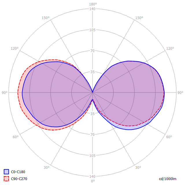 Het lichtdiagram geeft de bundel aan in het C0-C180 vlak (loodrecht op de lengterichting van de lamp) en de bundel in het C90-C270 vlak (in de lengterichting van het lichtgevende oppervlak, gelijk aan in de lengterichting van de lamp).