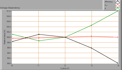 De variatie in efficiëntie (hier indicatief berekend door deling van verlichtingssterkte door vermogen) door het opwarmen is -18 %. Een erg hoog negatief getal duidt op een significante afname door bijvoorbeeld warm worden van de lichtbron (lagere levensduur).