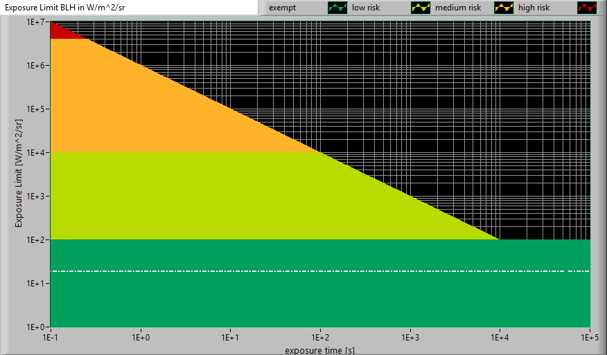 Het niveau van blauw licht van deze lamp tov de blootstellingslimiet en de verschillende classificatiegebieden.