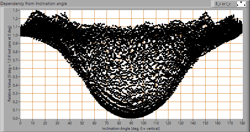 Deze plot geeft grafisch weer welke verschillende meetwaarden verkregen zijn bij iedere kantelhoek. Voor een bepaalde kantelhoek zijn er zo een aantal metingen, die afkomstig zijn van verschillende draaihoeken rondom de lamp.