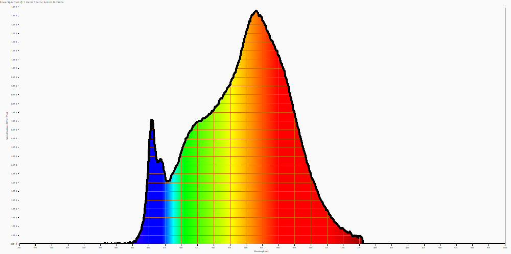 Het kleurspectrum van het licht van deze lamp. Energieniveaus geldig op 1 m afstand.