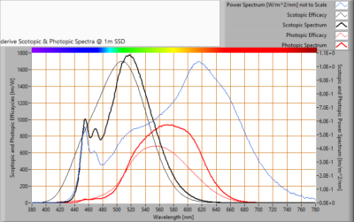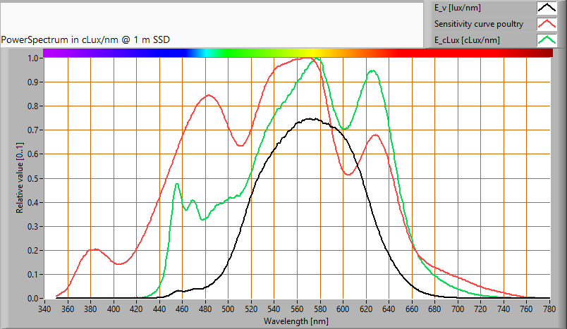 De energie in het spectrum van het licht van de lamp kan worden gewogen middels de spectrale gevoeligheid van het oog van kippen (N.B. Prescott and C.M. Wathes, 1999 en J. E. Saunders, J. R. Jarvis and C. M. Wathes, 2008).