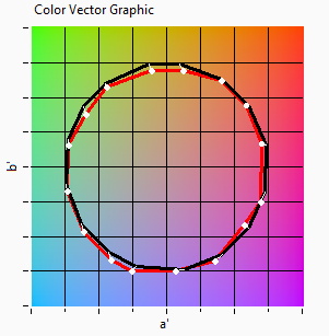 Grafische weergave van gemiddelde kleurpunten voor deze lamp en de referentielamp met gelijke kleurtemperatuur. Hierin kan men eventueel een verandering van kleur herkennen, en een verhoging of verlaging van de saturatie.