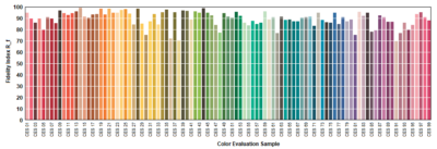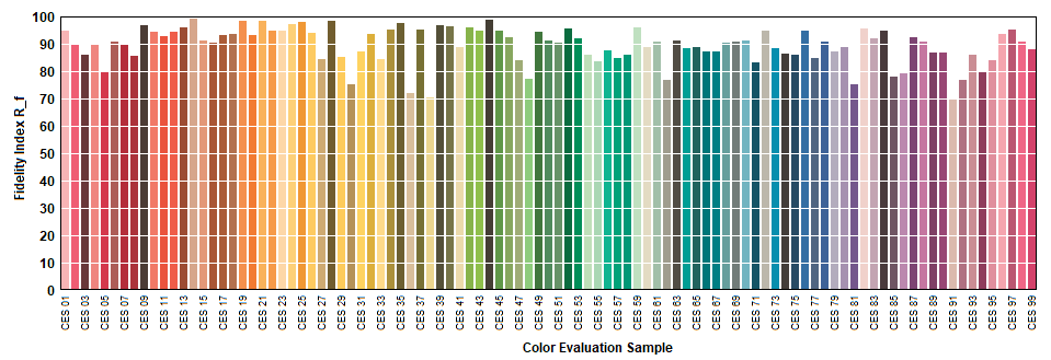 TM-30-15 Rf waardes voor 99 samples voor het licht van deze lamp. Wanneer deze de waarde 100 dicht nadert, betekent het dat de kleurweergave dichtbij die van de referentielamp zou zijn.