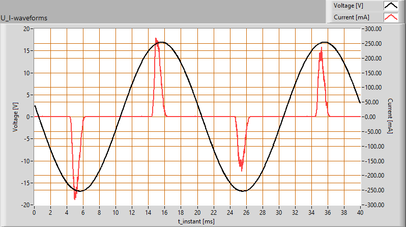De inschakelstroom is gemeten voor de verschillende starthoeken van de spanning van 0 – 170 graden (met stap van steeds 10 graden). De stroom- en spanningswaardes zijn met een acquisitiefrequentie van 39.9 kS/s binnengehaald. Daarna zijn de meetresultaten door een 2e orde 2kHz laagdoorlaat Butterworth filter gehaald. Hiermee worden zeer kortdurende, niet relevante, (stroom)pieken weggefilterd.