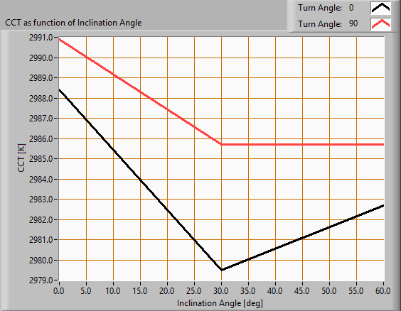 Voor het C0-C180 vlak: kijkende naar de stralingshoek van 360 graden dan komt dit overeen met 180.0 graden kantelhoek, dit is het gebied waar het meeste van het licht afgegeven wordt. De maximale variatie in kleurtemperatuur in dit gebied (kantelhoek) is ongeveer 0 %.