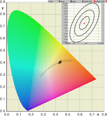 Een andere referentie is gegeven met de aangegeven gebieden voor wit licht in het kleursoortdiagram.