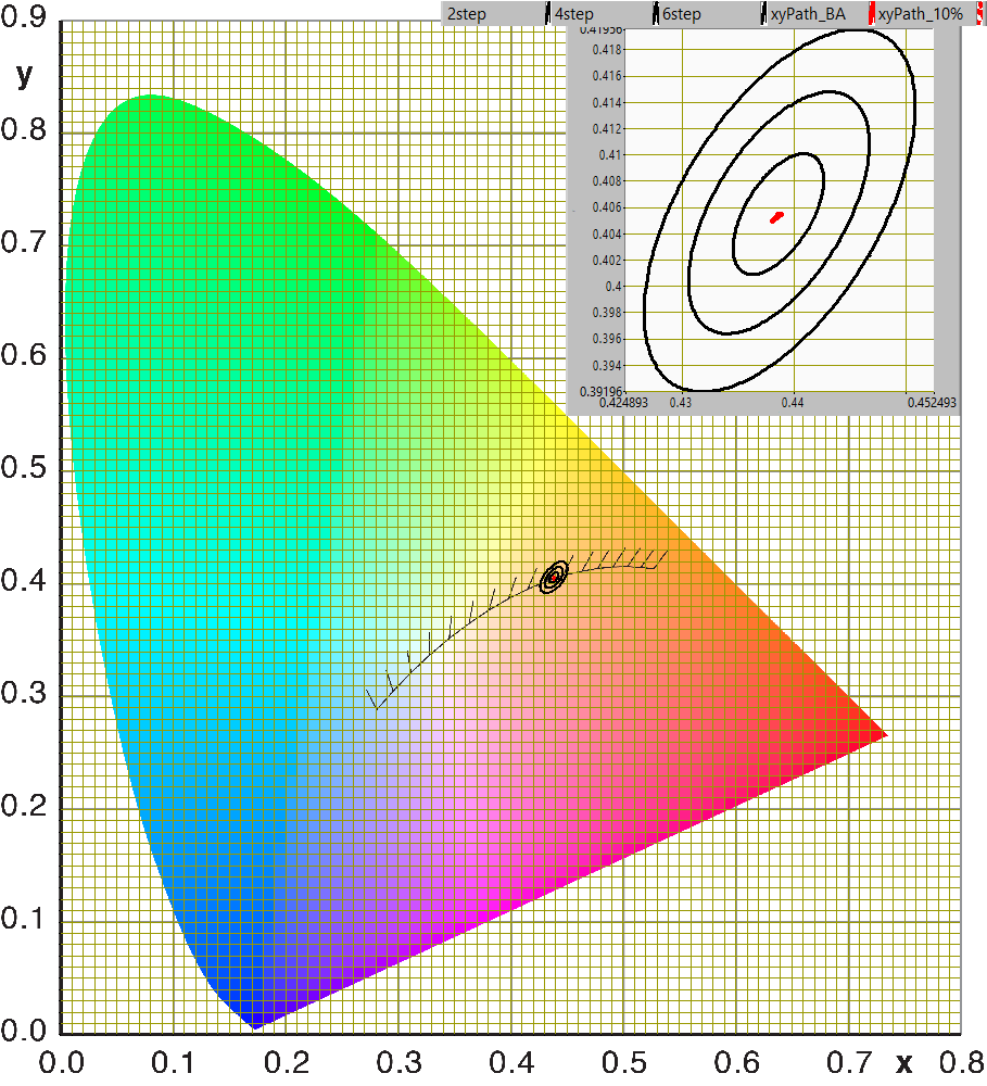 Kleurpunt afhankelijk van kantelhoek tov 2, 4 en 6 stap MacAdam ellips, voor alle hoeken binnen de stralingshoek (getrokken lijn) en voor alle hoeken waarbij Ev tot 10 % gezakt is (gestippelde lijn)