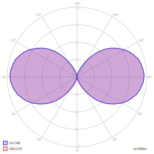 Het lichtdiagram geeft de bundel aan in het C0-C180 vlak (loodrecht op de lengterichting van de lamp) en de bundel in het C90-C270 vlak (in de lengterichting van het lichtgevende oppervlak, gelijk aan in de lengterichting van de lamp).