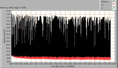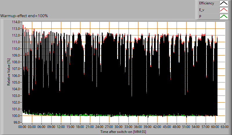 De variatie in efficiëntie (hier indicatief berekend door deling van verlichtingssterkte door vermogen) door het opwarmen is 3 %. Een erg hoog negatief getal duidt op een significante afname door bijvoorbeeld warm worden van de lichtbron (lagere levensduur).