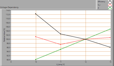 De lamp is onderzocht op hoe afhankelijk de parameters verlichtingssterkte E_v [lx] en het opgenomen netto vermogen P [W] zijn van de lampspanning. Uit de deling van E_v door P volgt een inschatting van de efficiëntie.