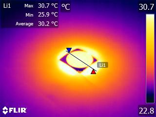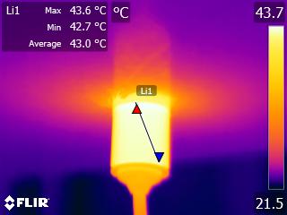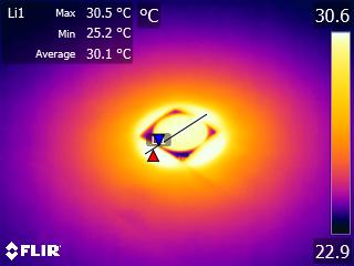 De lamp wordt maximaal ongeveer 18 graden warmer dan omgevingstemperatuur. Opwarmeffect: Gedurende de opwarming varieert de verlichtingssterkte niet significant (< 5 %). Gedurende de opwarming varieert het vermogen niet significant (< 5 %). Afhankelijkheid spanning: Er is geen (significante) afhankelijkheid van de verlichtingssterkte wanneer de voedingsspanning tussen de 10 – 14 V varieert. Aan het eind van het artikel een extra foto. |
