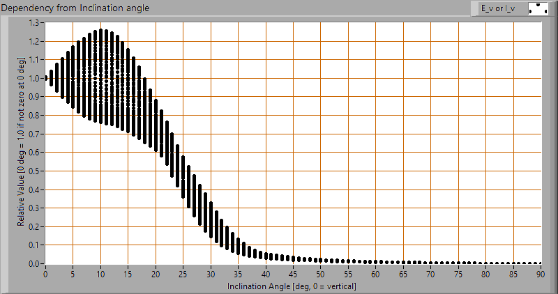 Deze plot geeft grafisch weer welke verschillende meetwaarden verkregen zijn bij iedere kantelhoek. Voor een bepaalde kantelhoek zijn er zo een aantal metingen, die afkomstig zijn van verschillende draaihoeken rondom de lamp.