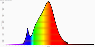 Het kleurspectrum van het licht van deze lamp. Energieniveaus geldig op 1 m afstand.