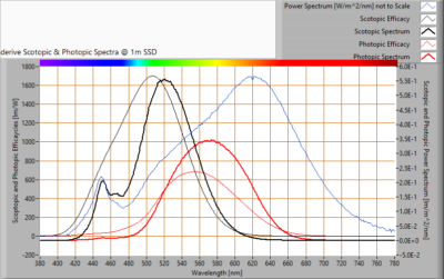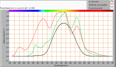 De energie in het spectrum van het licht van de lamp kan worden gewogen middels de spectrale gevoeligheid van het oog van kippen (N.B. Prescott and C.M. Wathes, 1999 en J. E. Saunders, J. R. Jarvis and C. M. Wathes, 2008).