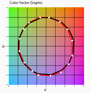 Grafische weergave van gemiddelde kleurpunten voor deze lamp en de referentielamp met gelijke kleurtemperatuur. Hierin kan men eventueel een verandering van kleur herkennen, en een verhoging of verlaging van de saturatie.